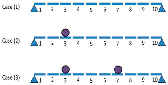 In the following example, the effect of adding masses to a structural element will be demonstrated, illustrating how this adjustment leads to noticeable changes in the natural frequency values, thus enhancing the accuracy of damage detection and localization. Figure 1 illustrates the studied 100 cm simple beam, which is divided into ten elements and analyzed under three distinct cases. In the first case, no additional masses are added to the beam. The second case introduces a single additional mass, while the third case incorporates two additional masses at different positions along the beam.
