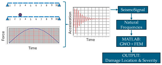In this paper, the GWO is employed as the optimization technique. The GWO offers several key advantages that make it ideal for structural damage detection and optimization tasks. Its simplicity and ease of implementation allow for straightforward adaptation to complex problems, while its strong global search capability ensures effective exploration of nonlinear and multi-dimensional solution spaces. The algorithm’s adaptability to various constraints and its competitive performance compared to other optimization methods further highlights its suitability for damage detection in structural health monitoring. The GWO algorithm simulates the leadership hierarchy of grey wolves, utilizing four types of wolves—beta, alpha, omega, and delta—to guide the search process. Each wolf type plays a distinct role in the optimization process, mimicking the social behavior observed in real wolf packs. The GWO algorithm searches for the optimal solution by simulating the natural hunting and attacking strategies of grey wolves. To perform the optimization, a MATLAB (R2024b) code was developed, and three main steps were implemented: hunting, prey searching, encircling prey, and attacking. These steps mirror the wolves’ behavior in nature, where the wolves work collectively to track down and capture prey. The optimization process is designed to find the best match between the calculated and measured dynamic characteristics, thereby identifying the location and severity of the structural damage [39].