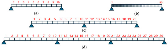 In this study, three distinct cases of a plain concrete beam are utilized to validate the effectiveness of additional masses and the GWO method. The 16 cases include a simply supported beam, a two-span continuous beam, and a three-span continuous beam, each subjected to different loading scenarios. These beam configurations, as illustrated in Figure 3a–c, represent a variety of real-world structural conditions, allowing for comprehensive testing of the proposed method under diverse scenarios. The cases in Figure 3a,b investigate the effect of the number of divisions on the simply supported beams. The cases in Figure 3c,d investigate the multispan beams.