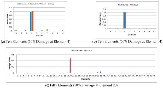 To investigate the effect of noise, Figure 4a illustrates a simply supported beam modeled with 10 elements, subjected to damage severities of 10% with and without a simulated data noise of 2 × 10−3 as a ratio. It can be seen that at this level of noise, the procedure was able to predict the damage location and severity with an error of 5% for the case with noise and 4.3% for the case with no noise.