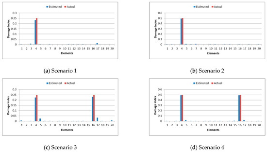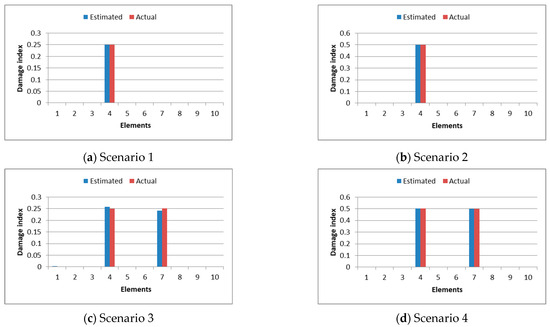 Figure 6a–d show the damaged elements of the two continuous spans beam. It can be shown that the proposed technique was able to estimate the damage location and severity closely for single or double damages, where the detection error is 7.52% and 1.78% for the case of scenarios 1 and 2, respectively, see Table 5. While for the case of scenarios 3 and 4, the detection error is 9.88% and 1.68%, respectively.