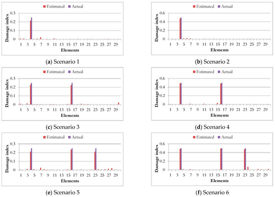 Figure 7a–f shows the damaged elements in three-continuous-span beams. It is shown that the technique detects approximately the damage location and severity, especially where multiple damages have occurred. The severity detection error is between 2.54 and 10.77% for the case of scenarios 3 and 4 and between 14.376 and 4.66% for scenarios 1 and 2. For the case of three spans found in scenarios 5 and 6, detection error is between 1.24 and 16.06%, respectively. It is also worth noting that some damage was detected in some undamaged locations with a severity of not more than 5% similar to the previous scenarios. That is because increasing the number of damaged elements has a bigger effect on the stiffness matrix that significantly affects the model shapes.