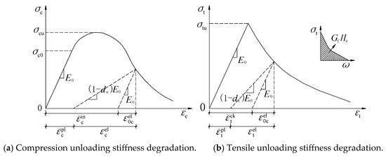 The degradation of concrete stiffness increases with plastic strain, and this degradation can be represented by the damage variable dt for uniaxial tension and dc for uniaxial compression [21,22].