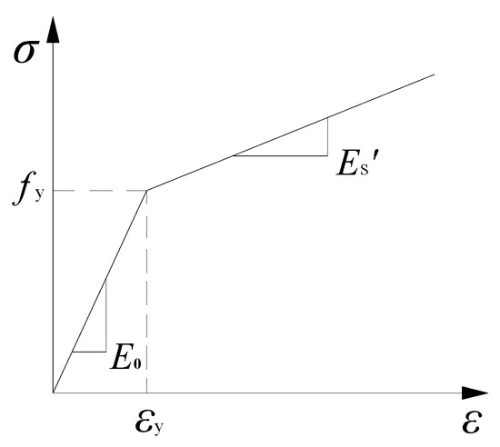 The stress–strain relationship of steel is represented by a bilinear model [28], as shown in Figure 2. The modulus of elasticity of steel after yielding is taken as 0.01E₀, where E₀ is the initial modulus of elasticity of the reinforcement. In addition, the initial yield stress is obtained from material property tests.