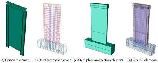 This study comprehensively considers the shear wall with FRC concrete in the plastic hinge zone and the steel plate-reinforced concrete shear wall, using specimens FRCSW-04 from Reference [29] and SW-F from Reference [30], respectively. The models were developed based on identical dimensions, material parameters, and loading conditions, with appropriate component types, boundary conditions, mesh sizes, and element types selected for the ABAQUS finite element model. The geometric model includes several components such as the concrete wall, steel plate, profile steel, and reinforcement. The concrete wall is composed of the foundation beam, wall body, end columns, and top beam (loading beam).