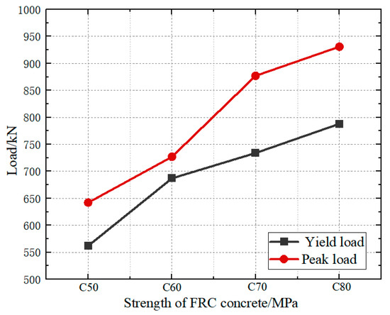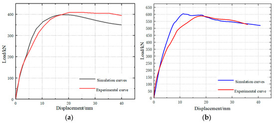 In this study, the concrete materials are modeled as C60 concrete and fiber-reinforced concrete, both of which use the plastic damage model. The viscosity coefficient is set to 0.005, the eccentricity is 0.1, the compressive strength ratio is 1.16, the value of K is set to 2/3, the expansion angle ψ is set to 42°, and the Poisson’s ratio is 0.2 [31]. To minimize the influence of the Poisson effect on the simulation and improve post-processing efficiency, the elastic modulus of the loading beam and foundation beam is increased by a factor of 100 to reduce the deformation caused by the load.