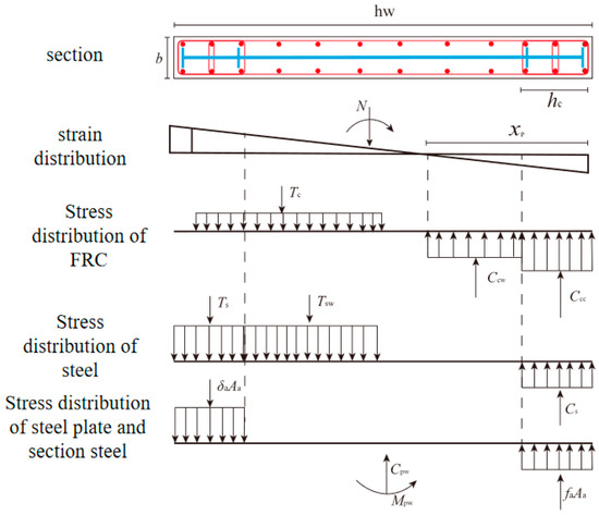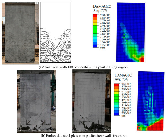The embedded steel plate composite shear wall structure exhibits high axial load-bearing capacity, making it suitable for high-rise buildings subjected to significant axial pressure on the lower floors. However, it is susceptible to buckling and failure during severe seismic events, and the presence of a single energy dissipation mechanism in the plastic hinge region at the base results in localized damage, which hampers post-disaster repairs and reinforcement [1,2,3,4,5]. A small shear span ratio significantly diminishes its seismic performance and deformation capacity, and consequently, the earthquake-induced damage to the structure is more severe. Fiber-reinforced concrete (FRC) [6,7,8,9] is a composite material consisting of cement mortar or plain concrete mixed with a suitable amount of high-toughness reinforcing fibers, exhibiting high ductility under tensile and shear stresses, along with multi-fine cracking and pronounced strain hardening characteristics. Additionally, it demonstrates effective crack width control as deformation increases. Simultaneously, the shear capacity, deformation, and energy dissipation abilities, as well as damage tolerance of flexural and shear members can be enhanced, leading to significant improvements in the seismic performance of concrete structures [10,11].