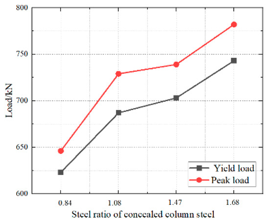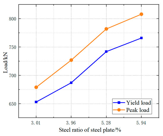 Figure 17. Load at key points for specimens with different steel ratio of central steel plate.