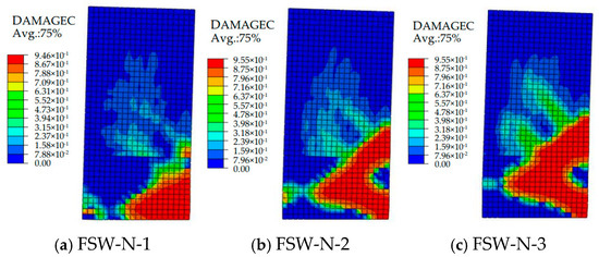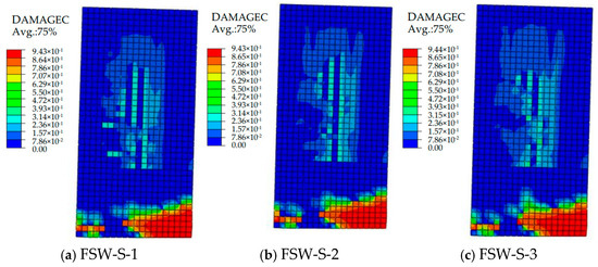 In the equation, ε ˜ c pl and ε ˜ t pl represent the equivalent compressive and tensile plastic strains of concrete, respectively; ε ˜ c in and ε ˜ t ck represent the compressive crushing strain and cracking strain (unloading strain when undamaged), respectively; dc and dt represent the compressive and tensile damage parameters of concrete, respectively.