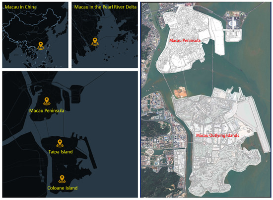 Macau is a port city on the coast of the Pacific Ocean and the South China Sea. It is located on the west bank of the Pearl River Estuary and at a low latitude south of the Tropic of Cancer. It is connected to Gongbei, Zhuhai, Guangdong in the north, Wan Chai and Hengqin across the tributaries of the Xijiang River, the Inner Harbor and the Jiamakou Channel to the west, Lantau Island in Hong Kong to the east across the Lingding Ocean, and the Wanshan Islands to the south [23,24,25]. The components of Macau include the Macau Peninsula in the north and the outlying islands in the south. The offshore area of Macau refers to the large island, consisting of Taipa, Coloane, and Cotai City [26]. Originally comprising Taipa Island and Coloane Island, after the construction of the Cotai Connecting Highway, reclamation and water flow from the West River brought a large amount of silt, the seabed between the two islands became shallower, and more and more land was formed along the highway. Therefore, the local government started planning for reclamation, and the resulting land became Cotai City (Figure 1), with a total area of about 32.9 km2. In 2020, the population density of Macau’s urban area was about 20,800 people/km2, which is one of the highest in the world [27]. Among these areas, the urban area of the Macau Peninsula is only 9.3 km2, and the population density is about 58,300 people/km2, representing one of the most densely populated cities in the world.