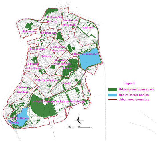 where GA is the area of urban green space in the planning area, NW is the area of natural water bodies in the planning area, and MS is the area of urban land. The calculation of the BGOR value for each sub-area of the Macau Peninsula can be quantified by the Macau GIS green open space database: