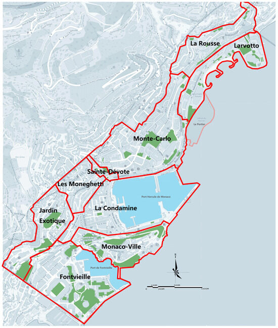The Principality of Monaco currently has eight urban administrative divisions: Fontvieille, Jardin Exotique, Monaco-Ville, La Condamine, Les Moneghetti, Larvotto, Monte-Carlo, La Rousse, and Sainte-Dévote, excluding the new district of Le Portier, which is under construction on reclaimed land. In addition, the study of the statistical area of the Fontvieille and La Condamine districts in Monaco’s urban subdistricts includes the natural waters of the two inner city harbors, Port de Fontvieille and Port Hercule de Monaco, respectively (Figure 4).