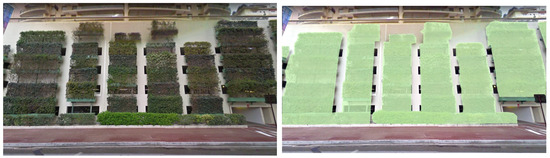 In some urban areas on the Macau Peninsula with low planar BGOR and façade BGVR values, the walls of buildings along the streets in many neighborhoods are not greened as a façade. Taking Rua dos Hortelãos and Avenida da Praia Grande in Areia Preta e Iao Hon district as examples, after simulating the façade area’s share of the building walls along the street and estimating the greenable space of the wall surfaces of the two streets in combination with the ArcGIS software, it was concluded that the BGVR values of the two neighborhoods could be increased by 21.5% and 28.0%, respectively (Figure 8 and Figure 9). If this wall greening is implemented, the neighborhoods with BGVR values that were originally at the poor level can be improved to a medium-high level. Therefore, in the case of urban land constraints that make it difficult to expand green space construction, the use of three-dimensional greening technology in high-density urban areas of the Macau Peninsula can effectively improve the greening level of the neighborhood’s façades, which is a greening pathway worth promoting in urban spaces.