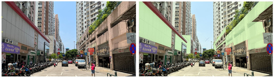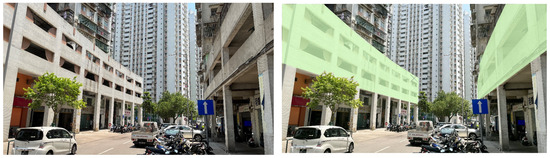 Regarding indicators for evaluating the amount of green in the three-dimensional urban façade landscape, the visible green index, i.e., the percentage of green in one’s field of vision, is researched more frequently in the academic world at present. In Japan, the green visibility index has been officially used to evaluate the greening level of urban neighborhoods. However, in a waterfront city, the natural elements in the streetscape space are not only green but also include the blue color of the water area. Therefore, this paper proposes to use the BGVR as an indicator for examining the level of naturalization of urban spaces. Referring to the calculation method for the stratified sampling of the green visibility rate, and taking into account the actual situation in Macau, the specific measurement method of BGVR is as follows: