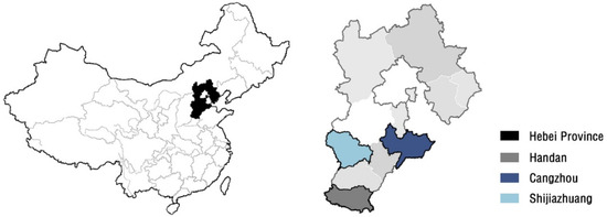 Hebei Province has rich industrial heritage resources, with the urban renewal and industrial structure adjustment as part of the transformation to mixed-mode parks. The mixed-mode industrial heritage park encompasses a variety of industrial models that complement and synergize with each other. This study conducted a preliminary investigation into the industrial heritage renovation projects of significant industrial cities in Hebei Province following the implementation of urban renewal initiatives, specifically targeting Shijiazhuang, Handan, and Cangzhou. The regional distribution is shown in Figure 1.
