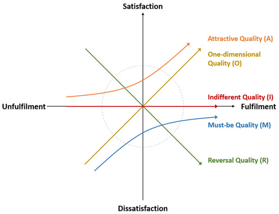 The Kano model is a prioritization tool for user needs created by Japanese professor Kano Noriako in 1984 [56]. It establishes the precedence of various demand indicators by administering a questionnaire survey to users. During the questionnaire design, users’ responses to different functional features are assessed through both positive and negative questions. Subsequently, these responses are calculated to classify the indices into five distinct categories: Must-be Quality (M), One-dimensional Quality (O), Attractive Quality (A), Indifferent Quality (I), and Reversal Quality (R). Must-be Quality pertains to the fundamental attribute that users deem as indispensable. One-dimensional Quality represents the expected indices of users, where the level of possession positively correlates with satisfaction. Attractive Quality encompasses attributes that surpass user expectations. Indifferent Quality exhibits no significant relationship with satisfaction. Conversely, Reversal Quality demonstrates a negative correlation with satisfaction [57,58,59]. These are shown in Figure 2.