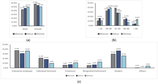 The statistical analysis reveals that female users slightly outnumber male users in terms of gender distribution. The primary user demographic consists of middle-aged and young individuals aged 18 to 45 years. Notably, Shimeiji Park, situated adjacent to the city park, also attracts a considerable proportion of elderly individuals over 60 years old. Conversely, Dahua Park, which boasts a substantial children’s amusement area, is more appealing to children and teenagers under 18 years old. Regarding occupation, the majority of users are enterprise employees and students. These are shown in Figure 3.