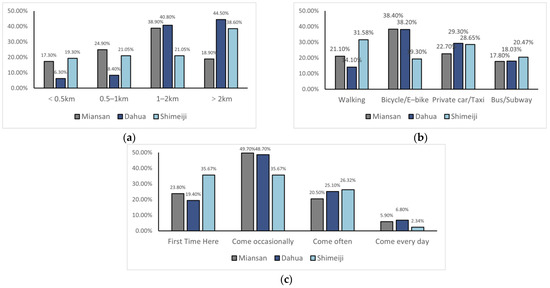 The statistical results show that the distance between the user’s residence and the park is more than 1 km, which shows that the park has a large influence. In terms of the choice of transportation modes, the three parks are different. In Miansan, bicycles/e-bike are used as the main means, while in Dahua, bicycles/e-bike are used as the main means, and also private cars, taxi rides, and public transportation are used, and in Shimeiji, walking is used as the main means. As for visiting frequency, most users come occasionally, and few people come every day. All the above three aspects are related to the geographical location and traffic conditions of the park. Among them, Miansan and Shimeiji are located in the central area of the city, with dense population and convenient transportation, while Dahua is in the non-downtown area, with sparse population and far distance. These are shown in Figure 4.
