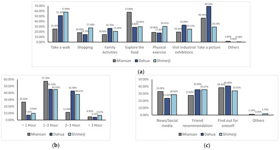 The statistical analysis shows that taking a walk and taking photos constitute the primary travel purposes for users overall. However, each park exhibits distinct characteristics. For instance, Miansan Park contains numerous restaurants, leading to a high proportion of users exploring food options. In terms of visit duration, most users spend 1–2 h in the parks. Regarding how users learn about the parks, the distribution across various channels is relatively balanced, with news and social media being less prominent sources of information. These are shown in Figure 5.