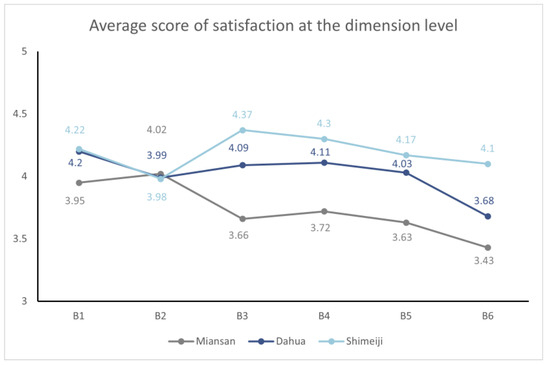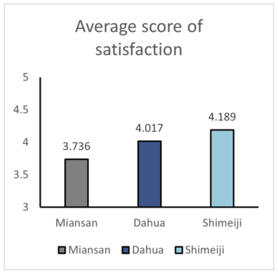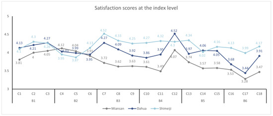 During the questionnaire survey, eighteen indicators were assigned specific values, and the satisfaction score was categorized into five levels, ranging from a minimum of 1 point to a maximum of 5 points, with a total possible score of 90 points. The average score for each park was calculated by dividing the total score of each park by the number of index items. The interpretation of these average scores was as follows: an average score of 1–2 indicated unqualified performance, 2–3 qualified performance, 3–4 good performance, and 4–5 excellent performance. The statistical results demonstrate that Miansan performed well, and Dahua and Shimeiji achieved excellent ratings, as illustrated in Figure 6.