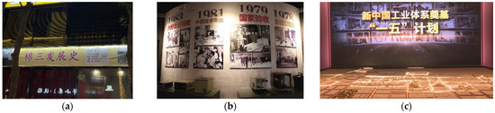 Historical and cultural exhibition of the park: (a) Miansan (The text in the picture means: History of Miansan); (b) Dahua (The text in the picture means: 1983 six good enterprise acceptance, 1981 Sino-Dutch technology Annual meeting, 1979 national acceptance, 1978 100 days of red news); (c) Shimeiji (The text in the picture means: The foundation of new China’s industrial system “The first five-year” plan).