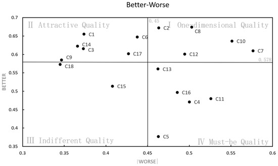 Finally, when optimizing the project, the priority order is the Must-be quality, One-dimensional Quality, Attractive Quality, Indifferent Quality, and the Reverse attribute should be avoided. To quantify the precise priority of each item within the index layer, the Better–Worse coefficient is employed to ascertain the demand priority; the calculation formula is as follows: (1)–(2). Specifically, the Better coefficient (B) typically assumes a positive value, and as it approaches 100%, the index in question becomes increasingly significant, thereby enhancing overall satisfaction. Conversely, the Worse coefficient (W) generally bears a negative value, indicating that a greater deviation from the ideal index leads to a corresponding decrement in satisfaction.
