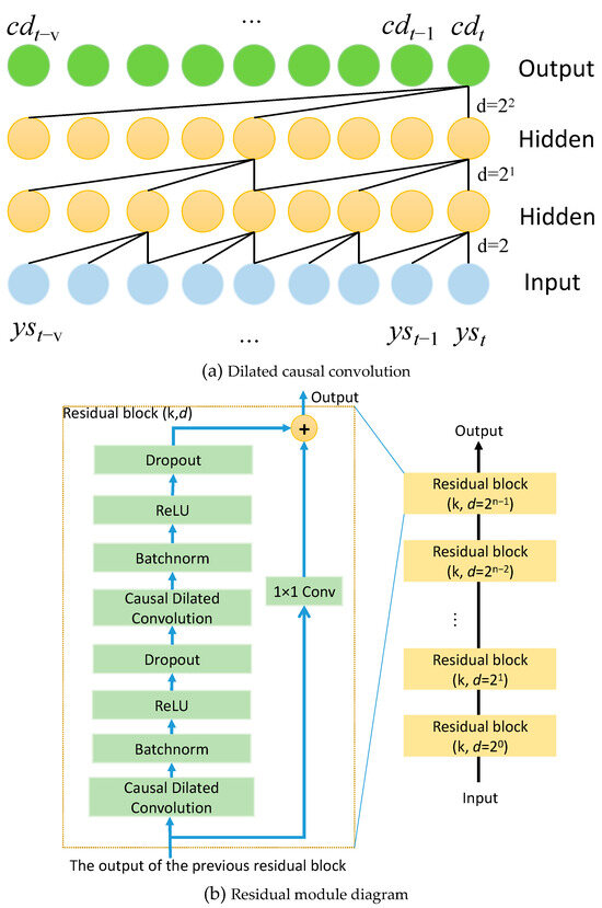 The time convolutional network [30] is a deep learning model specially used for processing time series data. It strengthens the feature extraction ability of time series data by adopting dilated causal convolution and residual modules. Compared with the traditional CNN model, the TCN has remarkable advantages in handling time series data. The dilated causal convolution of TCN can effectively enlarge the receptive field by adjusting the dilation rate, thus being able to capture the information correlation at a longer distance in the time series. The basic structure of the TCN network is shown in Figure 1.