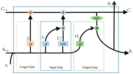 The memory units of the LSTM possess an inherent mechanism that enables them to remember information and selectively update and discard irrelevant information under specific circumstances [31]. Consequently, the LSTM network can effectively capture the complex temporal patterns within sequential data. The principle of a single LSTM unit is illustrated in Figure 3.