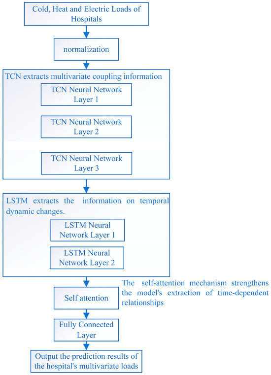 This paper proposes to use the TCN–LSTM–self-attention prediction model for multi-time scale prediction of cooling, heating, and power loads. The prediction process of the entire model is shown in Figure 5.