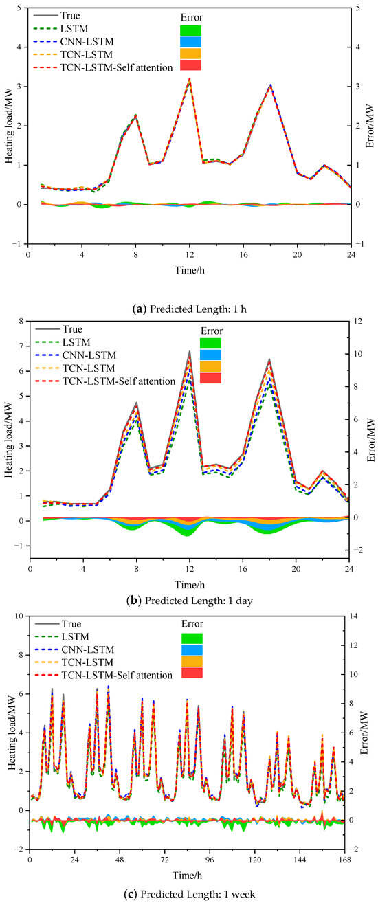 It can be seen from Figure 7 that the predictions of the heating load under different prediction time scales all have relatively high accuracy, and the fitting curves of the LSTM, CNN-LSTM, TCN-LSTM, and the method proposed in this paper are almost coincident. This may be because the hot water load in the building itself has more periodic regularity.