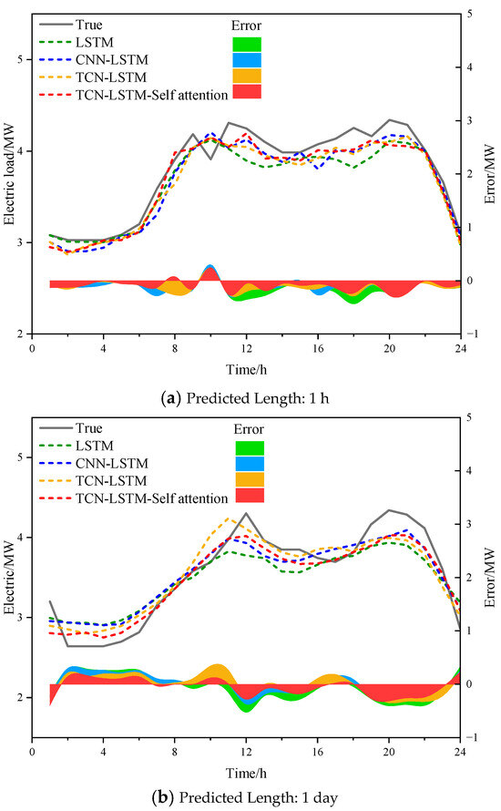 (1) It can be seen from the prediction curves that, only by utilizing historical load data, the TCN–LSTM–self-attention model proposed in this paper has good prediction effects in the prediction tasks on the composite scales of the building’s loads. This is because historical data contain the patterns and trends of the system operation within a certain period in the past, including periodic fluctuations, weather conditions, and other potential influencing factors. Based on these patterns and laws, the model can learn the characteristics of the system operation and predict, to some extent, the situations that may occur in the future.