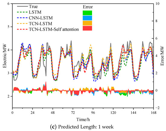 (3) In addition, the TCN–LSTM–self-attention model proposed in this paper has improvements compared with the CNN-LSTM model in predictions on multiple time scales. In the prediction tasks of cooling, heating, and electrical loads on the three prediction scales, the model proposed in this paper achieves an average improvement of 8.61% and 7.80% in the mean absolute percentage error (MAPE) and root mean square error (RMSE) indicators, respectively, compared with the TCN-LSTM model. Particularly, in the prediction task of cooling, heating, and electrical loads on the 1-week scale, the model proposed in this paper achieves improvements of 16.58%, 6.77%, and 3.87%, respectively, in the RMSE indicator compared with the TCN-LSTM model. This also proves that introducing the temporal self-attention mechanism into the TCN-LSTM model can strengthen the model’s ability to capture historical sequence information, help the model predict cooling, heating, and electrical load data more accurately, and make it more suitable for smart industrial buildings.