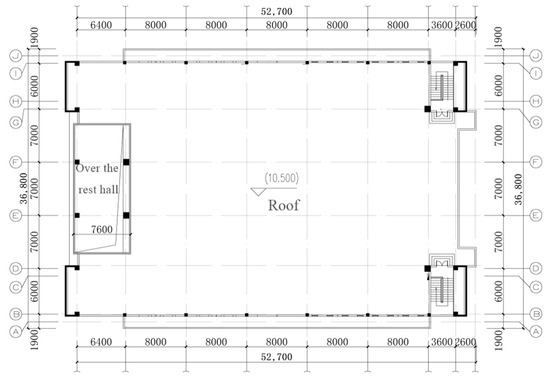 Based on a lecture hall, we established models for GHR, RG, and PVR, respectively. The building is a reinforced concrete frame structure, with a height of 10.95 m and two floors above ground. We used Software SketchUp 2017 to create the building model based on the building plan. The building has a flat roof with walls measuring 4 m in height on the south, north, and west sides, while the east wall is only 1.5 m high. The second-floor lounge on the west side features a glass curtain wall that is 6 m higher than the roof. The roof plan is illustrated in Figure 1. The basic model of the building and the building incorporates three design models for GHR, GR, and PVR, and the structure of the building is shown in Figure 2.