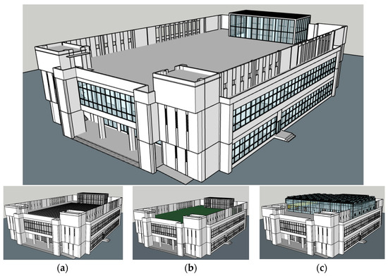 Lecture hall building model. (a) Photovoltaic roofs; (b) green roofs; (c) greenhouses roofs.