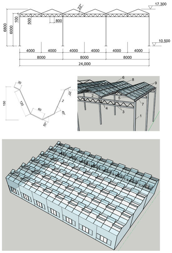 Haikou city is suitable for constructing GHR in a north–south orientation. The load-bearing members of the GHR are situated on the building columns and load-bearing beams below, ensuring enhanced structural safety. The modern greenhouse on the roof consists of two small roofs of 4 m each, i.e., a span of 8 m, an opening of 5 m, an eave height of 6 m, a ridge height of 6.80 m, and a truss height of 0.5 m. The east–west direction is 24 m, and the north–south direction is 35 m. The GHR has a surface area of 840 m2, and the utilization rate of the roof space is about 60%. The main component types, materials and cross-section dimensions are shown in Figure 3 and Table A1. The steel selection is Q235. This GHR opted for side sliding windows combined with the top-hung segmental roof windows for natural ventilation.
