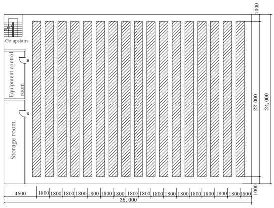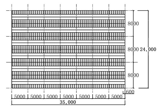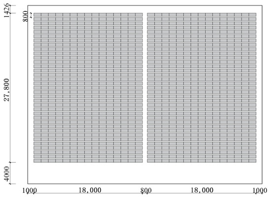 The variables used in this context are: d for the minimum spacing between PV arrays, a for the width of the PV panels, β for the tilt angle of the PV panels, δ for the winter solstice equinox of 23.26°, and φ for the latitude of the region. The study arranged the PV panels in a fixed manner and calculated their array parameters using Equation (1). The latitude of the Haikou area is 20.03°, and the width of the PV panels is 600 mm. The tilt angle refers to the optimal tilt angle reference value of PV arrays in the “Specification for Design of Photovoltaic Power Stations” [21]. The recommended tilt angle for the Haikou area is the latitude minus 3, which equals β = φ − 3 = 20.03° − 3° = 17.03°. There must be a minimum distance of 739 mm between the arrays when arranging the PV array. The height of the wall on the south side of the roof is 4 m, and the wall is vertical (β = 90°, δ = 23.26°, φ = 20.03°). The minimum distance between the PV arrays and the wall is 3.76 m. Equation (1) was also used in this calculation. After calculating the minimum spacing between the PV arrays, it was determined that the PV panels are arranged as shown in Figure 8. The distance between the PV arrays and the south side fence is set to 4 m, and the distance between the arrays is 800 mm, allowing for 35 rows. There is a 1-metre-wide aisle on both the left and right sides, with 30 PV panels laid in each row. The panels are arranged in 2 groups of 15 pieces each, with a distance of 800 mm between the groups. In total, there are 1050 PV modules.