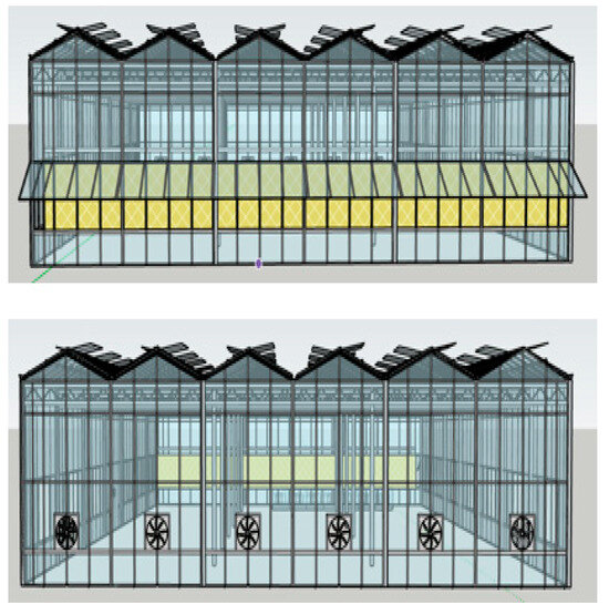 The crop cultivation planning in this study utilised single-layer cultivation beds with a width of 1.20 m for planting. A 0.6-m access space was left between the beds for crop management, and a 1-m-wide main access was created around the greenhouse to facilitate the transportation of production means. Additionally, a 4-m-wide area on the north side was allocated for equipment control and storage. This resulted in the placement of 17 cultivation beds, each with a width of 1.20 m and a length of 22 m, in the greenhouse. Figure 4 shows that the greenhouse planting area is 448.80 m2. Tomato planting is carried out at a density of 30 cm × 50 cm, with 176 tomatoes planted in each cultivation bed, resulting in a total of 2992 tomatoes planted in the greenhouse. During the summer, high temperatures can cause the greenhouse to become too hot. Therefore, it is necessary to take cooling measures. This greenhouse uses the wet curtain-fan evaporation cooling system. As per the “greenhouse wet curtain-fan cooling system design specification” [15], it is recommended to install the wet curtain and fan on opposite walls, with a distance of 30–45 m between them. The height of the wet curtain should be between 0.60–2.40 m, and the air inlet at the wet curtain should be closable without removing it. In summary, the arrangement of wet curtains-fans in the greenhouse is shown in Figure 5. The distance between wet curtains and fans is 35 m. The wet curtains are 1 m above the ground, 2 m high, and 150 mm thick, and they are arranged continuously on the south side of the mountain wall, with the windows at the air inlet openings in the form of outwardly flap windows, and one fan is arranged every 4 m on the wall on the opposite side of the wall for a total of 6 sets.