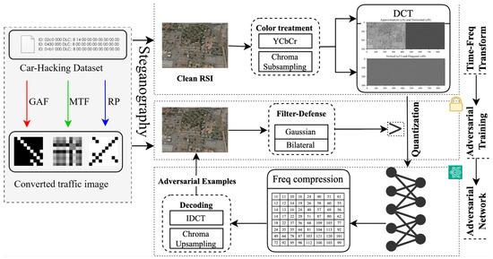 By fusing temporal and structural features into a unified image representation and embedding it in frequency-based AEs, our approach enhances feature integrity for accurate detection and enables stealthy transmission. Given a DL model and an original input , an adversarial attack seeks a perturbation such that