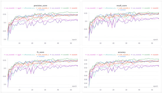 We evaluate the recognition performance of the RSSCN7 dataset with a ResNet50 model pre-trained on ImageNet [37]. The ResNet50 model, known for its deep architecture and feature extraction, is widely used in image processing. Its F1-score, which measures the balance of recall and precision, improves consistently with increasing training epochs in Figure 3. The convergence speed at which image classification converges with the pre-trained model is accelerated.