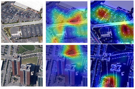 We apply Grad-CAM [39] to identify the discriminative regions of different models. We randomly select two images from the RSSCN7 dataset. Grad-CAM visualizations from the final convolutional layer of a ResNet-50 model are applied to 224 × 224 input images. Figure 4 shows the heatmaps of clean samples with attention distribution in different parts of images. In a parking scenario, areas with high vehicle density often exhibit elevated thermal signatures, whereas open or vegetated regions tend to show lower heat levels. In the heatmap of AEs generated during the FGSM attack (right column), a noticeable shift in attention regions can be observed. This indicates that, although the AE appears nearly identical to the original, the attention of DL-based models alters when processing such inputs. This redistribution in focus may lead to image misclassification. For instance, on the RSSCN7 dataset, recognition accuracy decreased under these conditions.