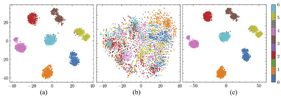 The clustering visualization of the RSSCN7 dataset. (a) The clustering of clean examples, (b) the clustering of adversarial examples, and (c) the clustering of robust examples.