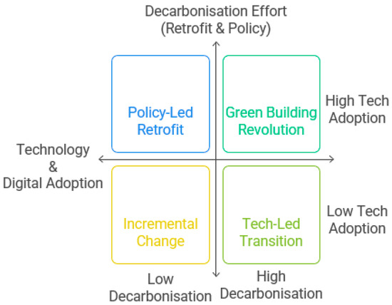 The comparative assessment highlights significant variation in performance across the four scenarios. The BAU pathway consistently underperforms across all domains, reflecting low renovation activity, limited electrification, and fragmented policy coverage. By contrast, the Accelerated Sustainability scenario delivers the most balanced and ambitious outcomes, achieving strong emissions reductions, comprehensive whole-life carbon integration, and notable co-benefits for health and liveability. The Technological Transformation scenario demonstrates leadership in technological adaptability, enabled by high electrification and digital penetration. However, in the absence of complementary policy guardrails, its performance on equity, liveability, and long-term emissions mitigation remains only moderate. The Climate Resilience scenario excels in strengthening adaptive capacity through distributed infrastructure and community resilience measures, but without deliberate integration of decarbonisation, it risks underachieving on mitigation. The findings suggest that a policy-driven, yet technologically enabled pathway constitutes the most comprehensive and balanced strategy for advancing a net-zero and climate-resilient built environment, thereby directly fulfilling the study’s objective of identifying robust and actionable frameworks for decarbonisation and resilience.