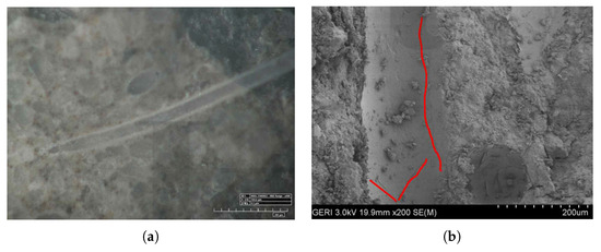 Void structures and their influence on sound absorption performance are investigated. When taken by an SEM, the red line shows having an uneven rough surface, and it was confirmed the average 3D woven textile fiber diameter. The voids form an air layer inside the mortar, hindering vibration energy transmission and absorbing noise, thereby playing an important role in noise reduction.