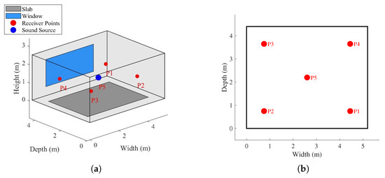 Measurements of 3D woven textiles were conducted inside the testing laboratory. The sound reduction within the acoustic chamber during the testing of each specimen was assessed. We utilize a lightweight impact source standard like a tapping machine along with microphones and a sensor signal acquisition device. The installation method and the positions of an impact point and five receiving points are detailed in KS F 2810-1 [46], shown in Figure 16. And sound insulation is measured to conform to the KS F ISO 717-2 [26].