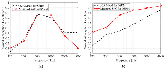 Comparison of theoretical JCA and measured SAC in reverberant room of (a) SSRM (b) DSRM.