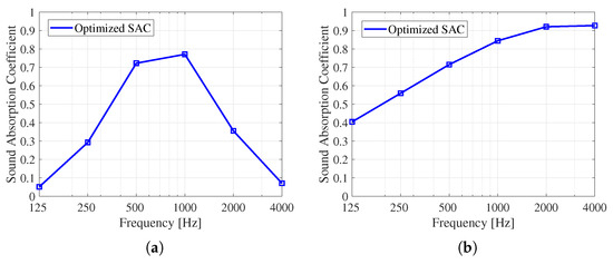 An iterative method is used to fit the JCA model and measured values that are closer to the desired SAC, as shown in Figure 6. Material thickness at low frequencies has an important effect in reducing acoustic energy [37]. Therefore, increasing the thickness of DSRM generally outperforms SSRM in absorption performance at frequencies below 125 Hz and above 500 Hz. From frequency of 250 Hz onwards, the absorption coefficient of DSRM tends to increase rapidly from 0.5 to 0.8 after covering two layers of textiles, while SSRM witnesses a considerable decrease at both mid and high frequencies. Within the 125 Hz to 500 Hz range, the absorption coefficient of SSRM climbed up to 0.8, with peak performance occurring around 1 kHz, and then dropping below 0.1 at 4 kHz. This can be attributed to the presence of multiple filament yarns in textiles like perforated holes, which allow them to absorb well while eliminating sound wave reflection.
