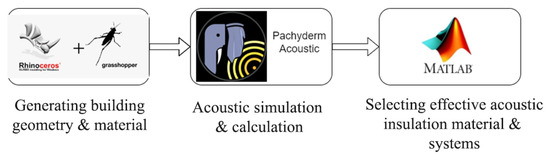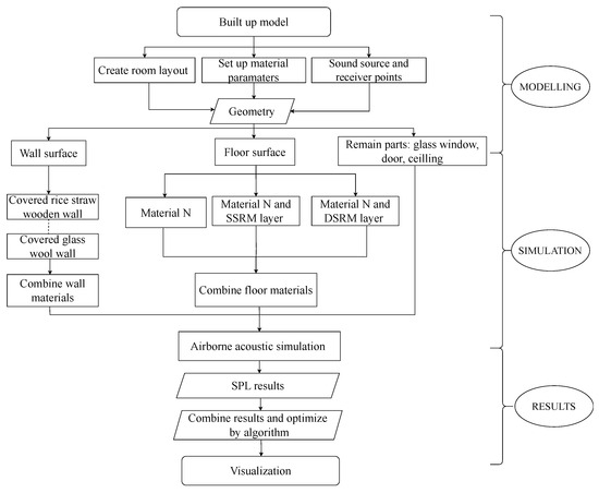 The acoustic simulation process is carried out in two different ways: considering different 3D woven textile materials (NRM, SSRM and DSRM) or adding a new layer as needed. Their output usually includes acoustic metric values that are employed to quantify sound level distribution and sound propagation, respectively. A comprehensive framework is illustrated in Figure 11, which provides a diagram of the entire simulation process in the most detailed and concise manner.
