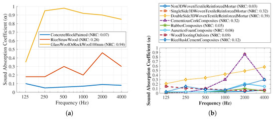 Sound absorption coefficient of different walls (a) and floor materials (b) [40].