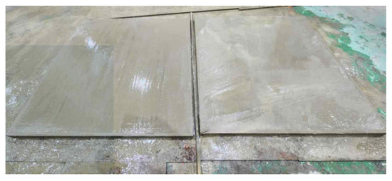 The 3D woven textile was cut to match the specimen’s dimensions and applied as illustrated in Figure 13 for mortar pouring. After pouring according to the capacity of the mold, the compression and surface flattening were performed. Pouring the finished mortar, it was finished with vinyl to prevent the evaporation phenomenon of moisture, and curing was conducted for 28 days in a laboratory environment at 20 °C. After curing, an anchor was attached to the specimen to facilitate demolding of the mold and transporting it to the experimental place.