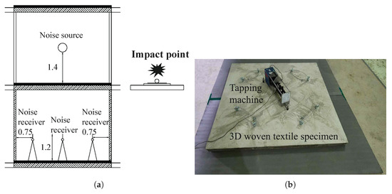 The scope of 3D textile test floor was defined as a flat plate made of reinforced concrete with a rectangular plane and a thickness of 210 mm or more according to the Korean standard KS F 2865 [41] on measurement and evaluation method of acoustic impact noise reduction performance of apartment buildings. This evaluation method was used similarly to the impact sound generated in previous studies [19,42].